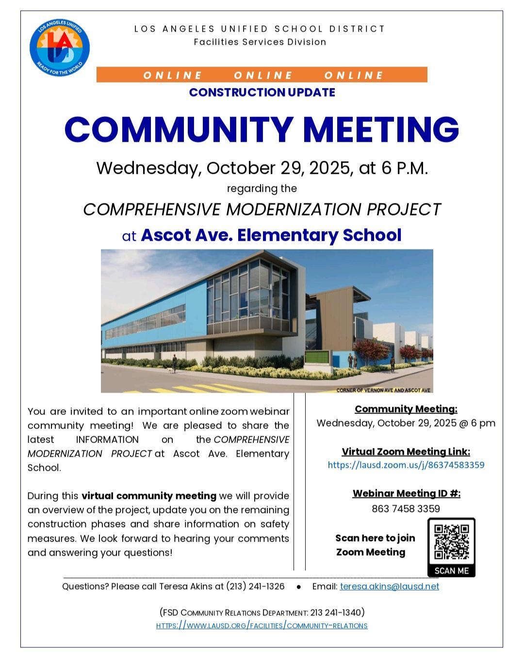 Join us Wednesday, October 29, 2025, at 6 PM for an online meeting about the Comprehensive Modernization Project at Ascot Ave. Elementary School.